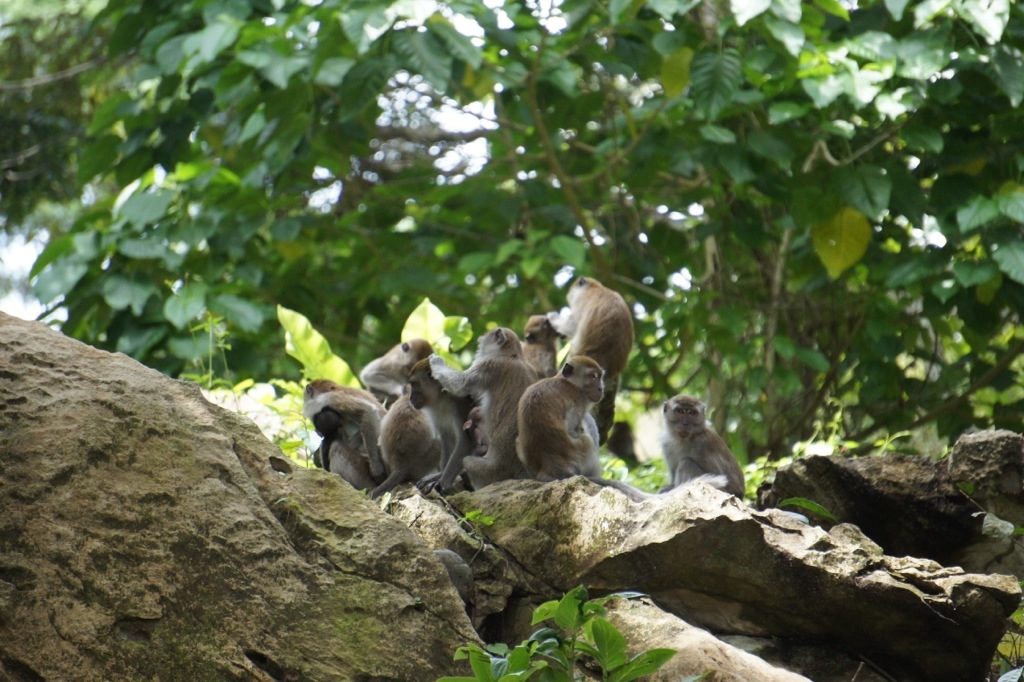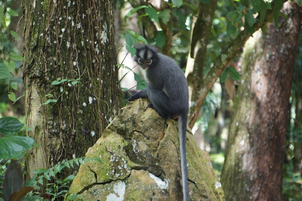 When we got closer to the village we came across two troops of monkey, literally a hundred feet from each other. One was a group of twenty or so Macaques grooming each other on some rocks. The other were Thomas Leaf Monkeys. These guys were the punk rock bad boys of the monkey world. They are gray with white bellys, and a black Mohawk. They were jumping all over the ground and trees, enjoying their durian snack.
