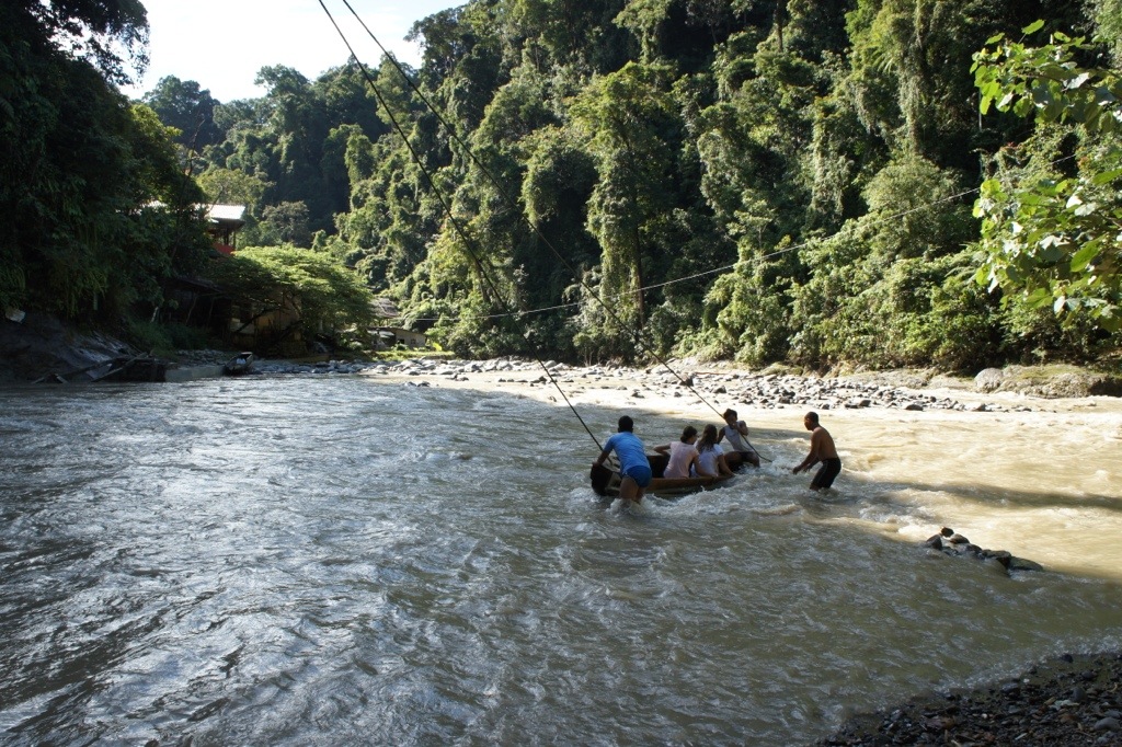 Well we had a pleasant evening in our jungle lodge, drank some lovely Bintangs, sat on our veranda and watched a big lightning storm, and enjoyed the hammock. Next day waking up fresh we decided to take a little walk down the river. The river is a brown torrent, more of a series of rapids shooting past at high-speed. Well we did not get far before there were a bunch of guys stripping down trying to get to the other side to get the boat. See we were at the entrance of the national park and we were at the cross over, but the boat had not gone for five days because of rain and high water.