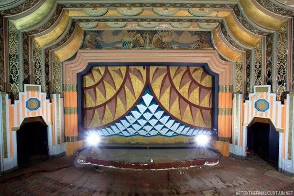 That was a decade ago, and the Boyd is not saved yet. There were many near saves, renovation even started with a paint study and even a paint Mock Up that revealed the original dazzling Art Deco colors being done by Clear Channel. But big projects can be fickle, especially during a recession, and it fell through when Clear Channel decided to get out of the theater business altogether. During the renovation process we discovered murals dedicated to women, the original seat upholstery pattern, and the original fire curtain. The fire curtain has a gorgeous bright Art Deco geometric design on it.
